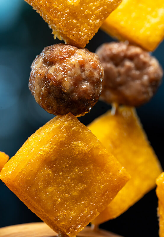 Da noi si festeggia al centro tavola: spiedini di carne e verdure, frutta spiedinata, salumi, formaggi… Tutto da condividere, tutto da gustare con le mani e col sorriso.